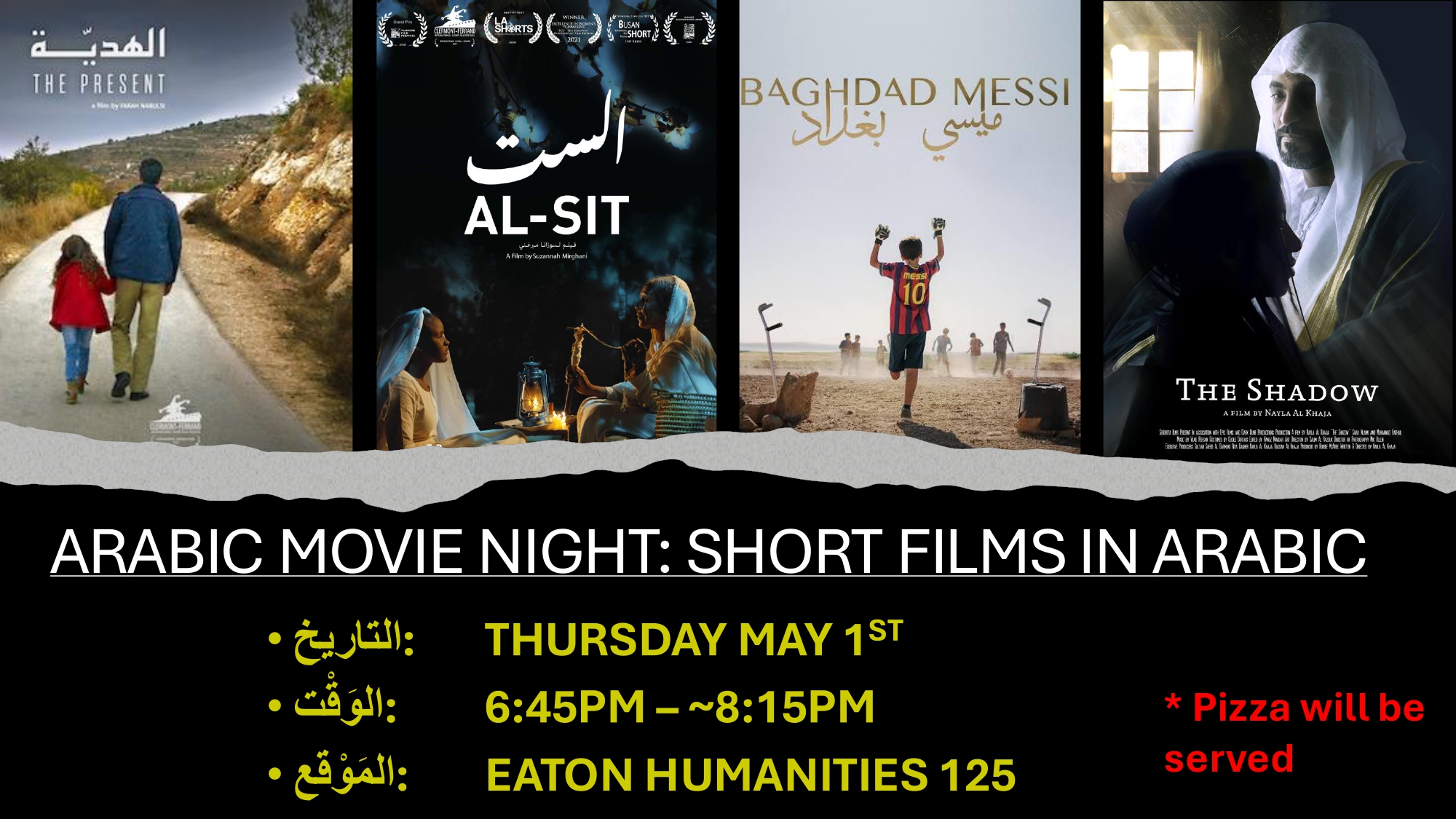 Join us for Arabic Movie Night: Short Films in Arabic on Thursday, May 1st from 6:45 - 8:15pm at HUMN 125. Pizza will be served!